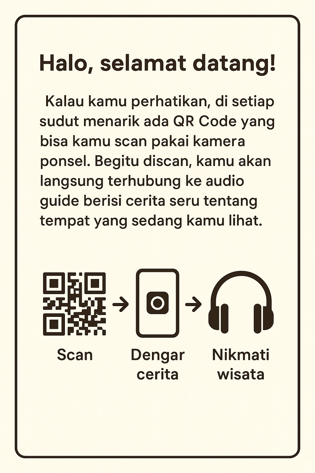 Bayangkan seperti punya pemandu pribadi: kamu bisa dengar sejarahnya, kisah unik yang jarang diceritakan, sampai info menarik yang bikin perjalananmu lebih hidup. Jadi, sambil berjalan santai, cukup buka ponselmu, scan kodenya, lalu dengarkan—semudah itu. Yuk, coba sekarang dan nikmati pengalaman wisata yang lebih interaktif!”